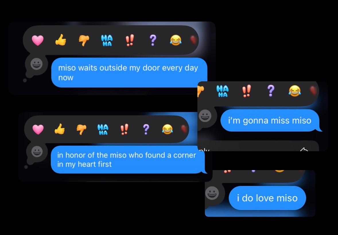 One of my biggest regrets is not going back and finding Miso. My partner reminds me often — “you cannot save them all, my dear.” But out of all the stray cats and dogs out there, Miso haunts me the most. While it brings me some comfort to learn that the other neighbors on the street all also established legacies of current tenants feeding her, I cannot bring myself to imagine a reality in which she is not happily fed and free. (This ruminative anxiety is made worse by the fact that, later that year, my housemate and I will name another fellow stray that frequented our street Apollo, feed him for weeks and months only for him to disappear, then eventually find out he had been hit by a car one weekend when neither of us were home. Our neighbors were the ones to bring him to the vet and decide to put him down).